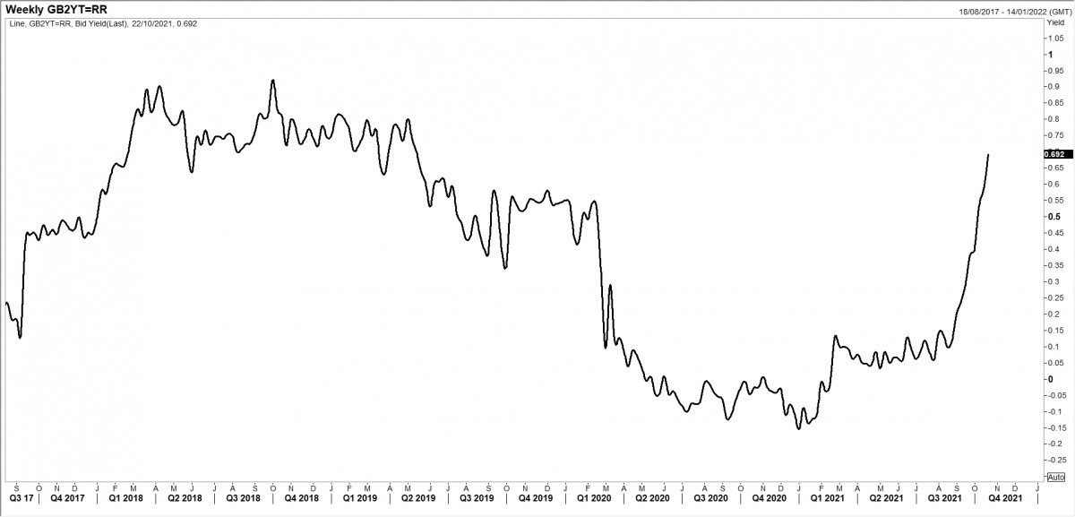 - ABD Dolarının bebek adımları da olsa değer kaybetmesi, özellikle Sterlin cephesinde güçlü görünüme de destek veriyor. İngiltere'de faiz artırım ihtimalinin yüksek perdeden konuşulmasına paralel iki yıllık İngiliz tahvillerinin de son 2,5 senenin zirvesine yükseldiğini, GBPUSD paritesinin ise 1,3830 seviyesine kadar bu sabah yeniden yükseldiğini görüyoruz (bakınız grafik). 1,37 seviyelerinin diplerinden aldığımız GBPUSD pozisyonlarmızı, haftalık kapanışın teyit etmesi durumunda güçlendireceğiz.