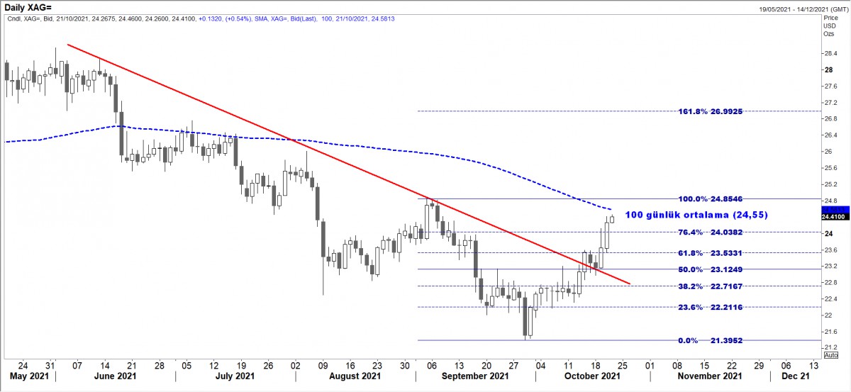 - Yurtdışı piyasalarda ise dün parçalı bulutlu başlayan gün, gün içerisinde yerini temkinli iyimserliğe terk etti. Özellikle de, geçen hafta yeniden soyunmuş olduğumuz gümüş pozisyonumuzun kuzeye doğru ilerlemesi bizlere sevindirdi (bakınız grafik). Belki çok tekrar olacak ama, sene başı raporumuzda dile getirdiğimiz gümüş özelinde oldukça iyimser beklentilerin hayal kırıklığı ile yılın ilk 9 ayında sonuçlanmasının bizler de hayal kırıklığı içerisindeyiz.