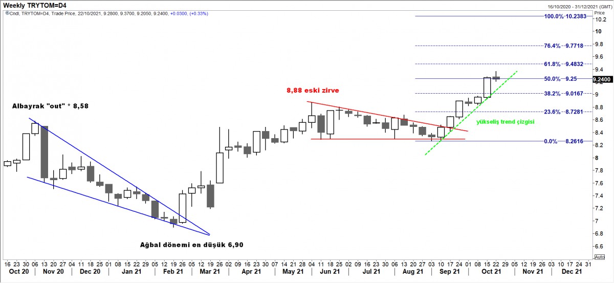 - Dün, bu minvalde, gelişmiş ülke merkez bankalarını yaptığı gibi piyasalara forward guidance -ileri rehberlik- sunamayan ve sürprizlerle dolu olan TCMB'nin acaba aklı selim politikalar izleyerek, son 7 haftadır yaşanan türbülansı göz önüne alarak faiz oranlarını değiştirmeyebileceği ihtimali de fiyatlama davranışına girmiş olmalı ki USDTRY kuru günün ikinci yarısında sabah test ettiği 9,35 seviyesinden 9,20 seviyesinin diplerine kadar gevşedi.