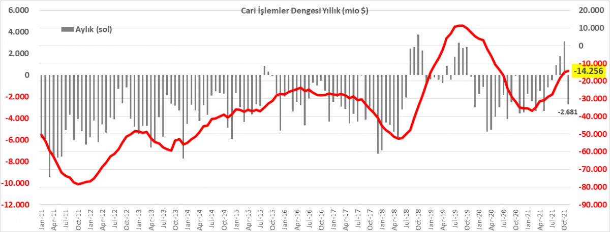- Dün sabah saatlerinde içeride açıklanan cari işlemler dengesi göz ucuyla takip edilirken, zihinlerde ise günün ikinci yarısında konuşacak olan FED Başkanı Powell vardı. TCMB verilerine göre cari denge Kasım ayında 2,68 milyar dolar açık verdi. Finans hesabının 1,05 milyar dolar fazla vermesine rağmen (-2,68+1,05 = -1,63) rezervlerin 2,83 milyar arttığını gördük. Bu noktada ise bir uyarlama hesabı olan net hata ve noksan kaleminin büyük bir sürpriz ile (4,46 milyar dolar) ön plana çıktı (detaylar için bakınız grafik).