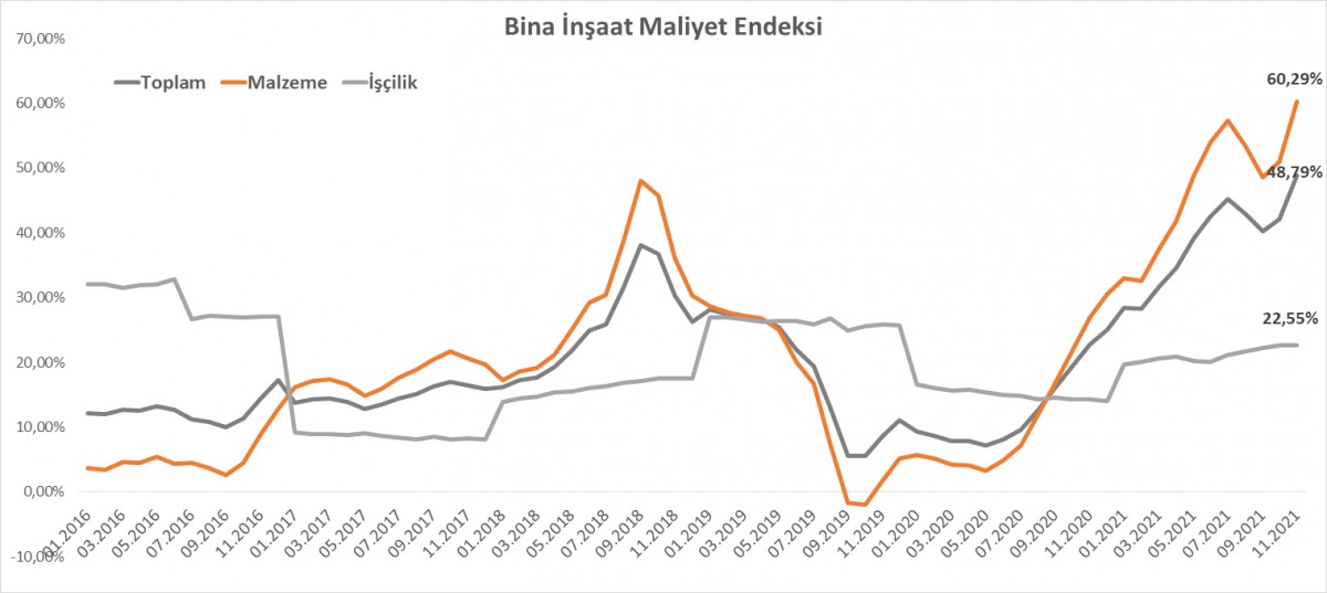TÜİK'in açıkladığı verilere göre inşaat maliyet endeksi Kasım ayında geçen yılın aynı dönemine göre %48,9 artış kaydetti. Bina inşaat maliyetindeki yıllık artış oranı %48,8 olurken, verinin alt kalemlerinde malzeme endeksindeki artış oranı %60,3 ; işçilik endeksindeki ise %22,6 artış oldu. Elbette, Kasım ve Aralık ayında TL'de yaşanan sert erime sonrası maliyetlerin son haftalarda çok daha sert bir şekilde kaçınılmaz olarak konut fiyatlarını da yansıyacağını düşünüyoruz.