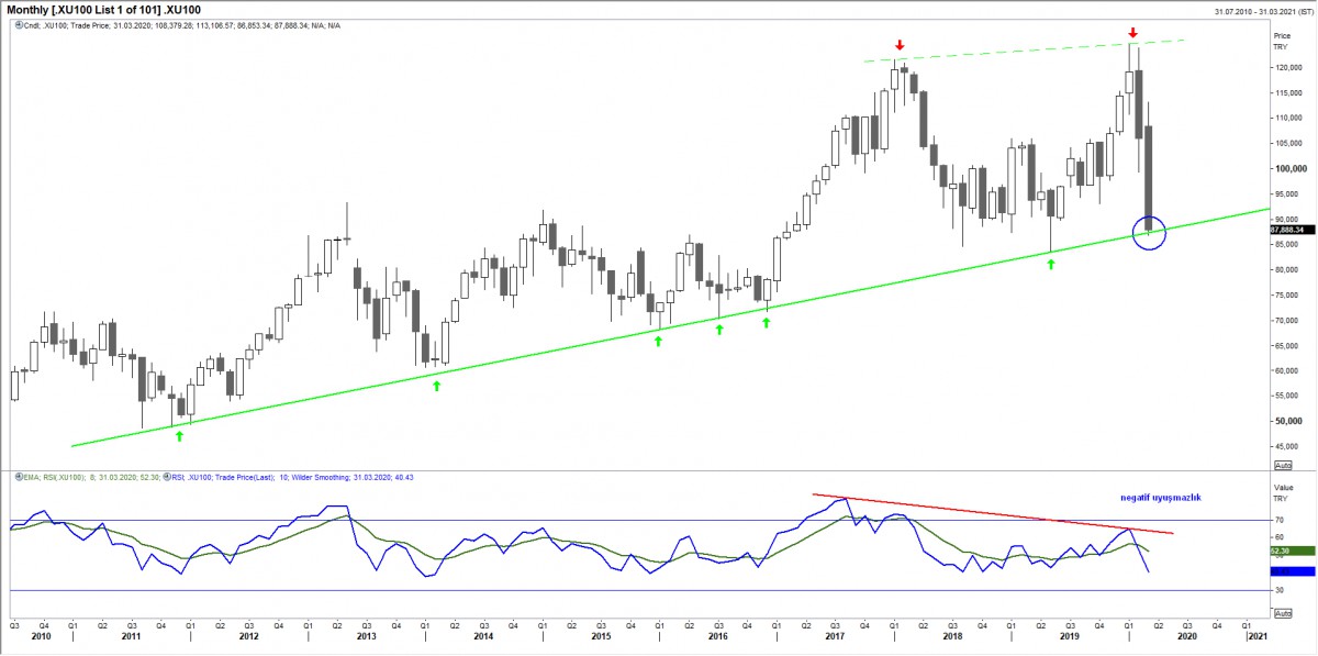Teknik bir bakış açısı ile yükseliş trendinde olan BIST100 endeksi, dün 87,888 seviyesinden günü kapatarak uzun bir süredir beklediğimiz önemli ve yılların getirdiği teknik çizgiyi test etti (mavi daire). Alım yapmak isteyen yatırımcılar, kademeli bir şekilde altını tekrar çiziyorum kademeli bir şekilde, alım deneyebilir. Mal krizde ve ucuzken alınır.