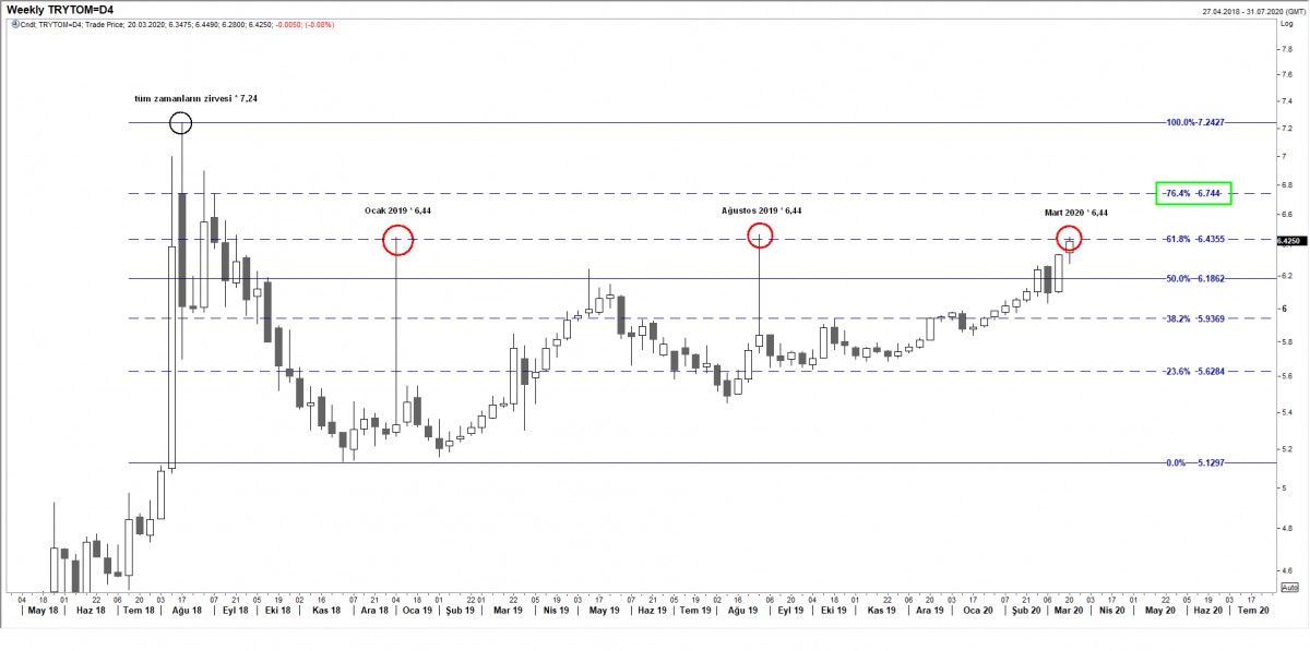 Günlerdir bültenlerimizde ön plana çıkardığımız 6,44 seviyesi dün akşam test edildi. Söz konusu seviye son 14 ayda üçüncü kere test ediliyor. Küresel piyasalarda var olan huzursuzluk ve panik devam ederse, yukarda bir sonraki seviye 6,74 olarak ön plana çıkıyor. Öte yandan hava sakinlerse, aşağıda 6,18 seviyesine varan bir düşüş de göz ardı edilmemelidir. Şu anda pozisyonumuz yok, beklemedeyiz!